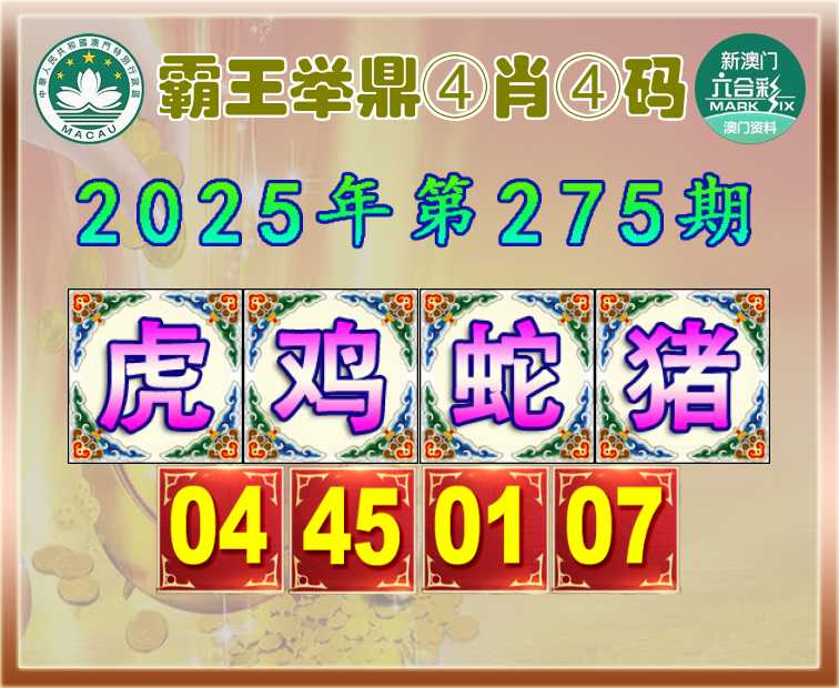 275期:《霸王举鼎》 🎪④肖④码🎪【虎蛇猪】【04.45.01.07】开:鸡45